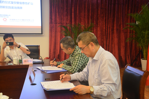 儀式上,滁州中聯水泥有限公司、安徽省煤田地質局勘查研究院安徽省綠色礦山工程研究中心三方進行了座談交流。為了深入踐行“綠水青山就是金山銀山”理念,高效推動綠色礦山建設工作,就如何對礦山綠色勘查、綠色開采、環境治理與修復、地質環境監測、智慧礦山等環節進行了探討。隨后,各方派代表現場簽訂了戰略合作協議進行安徽省綠色礦山工程研究中心創新實踐基地揭牌工作。