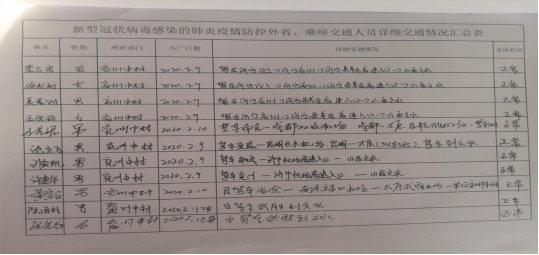 8、我們做了員工排查,建立返崗人員登記制度對返回人員登記,每天微信群詳細記錄職工身體狀況、假期外出情況、與重點疫區人員接觸情況等信息;對每名員工近14天的去向進行排查;對來自或去過疫情重點地區的員工建立重點監控清單,規勸其留在當地暫不復工,鼓勵員工延遲上班;對來自或去過疫情重點地區的員工排查其抵達時間,按規定落實醫學觀察、隔離等措施,確保其隔離觀察14天并經體溫檢測正常、無不適癥狀后方可上崗。進入崗位工作前自覺接受體溫檢測,體溫正常方可進入工作區,并洗手消毒。嚴格執行各項疫情防控要求,建立和落實復工上崗前個人防護知識培訓,多種方式普及傳染病防護知識,做到有癥狀早發現、早報告、早隔離、早治療。
