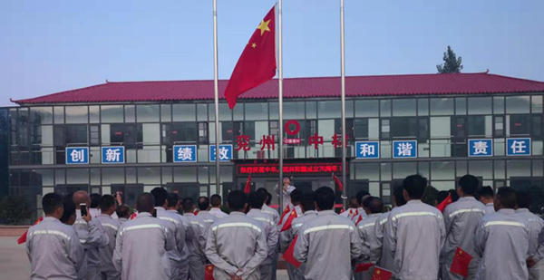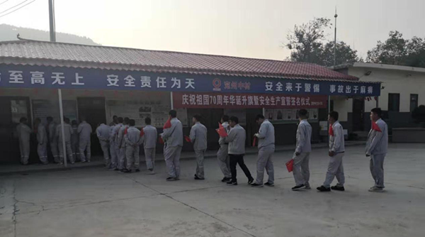 在這個秋高氣爽、瓜果飄香,到處洋溢著一片豐收景象的時節,我們迎來了偉大祖國的70周年華誕。為慶祝祖國的生日,兗州中材蘭陵分公司在辦公生活區,組織開展了以“愛國敬業,安全發展”為主題的升國旗、安全生產宣誓等一系列活動。 “全體肅立,行注目禮,升國旗,奏唱國歌!”伴隨著嘹亮的國歌,五星紅旗冉冉升起,兗州中材蘭陵分公司全體人員,莊嚴肅靜,目光隨著紅旗升高。旗升至頂,全體人員注目禮畢,高呼“我愛你中國,祖國萬歲”。 祖國是大家,家庭是小家。每個員工的安全,決定著一個家庭的幸福團圓,進而牽動著祖國的和諧發展。因此,始終要把安全放在首位。“我宣誓:時刻牢記安全生產方針,遵守安全生產法律法規,服從公司安全管理規定,認真履行安全生產責任,全面提高安全技能,讓家人放心,讓企業放心,做一名合格的員工!”錚錚誓言,從每名員工口中朗朗而出,飄蕩在礦山,回蕩在心田。
